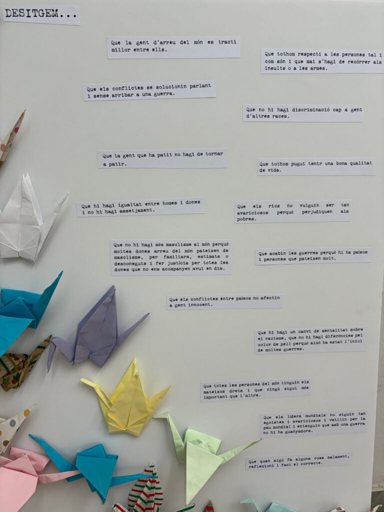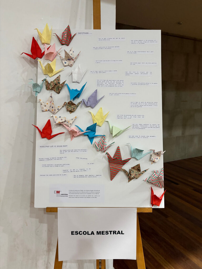 Els alumnes de 5è i 6è de primària han treballat el dia de la No-violència a través d’un vídeo on han pogut conèixer la història de la Sadako i les mil grues de paper. La Sadako va ser una nena que va patir l’atac de la bomba nuclear a Hiroshima i es va dedicar a crear grues de paper, ja que, segons una llegenda, si feia 1.000 grues podria demanar un desig. Malauradament, va morir abans d’acabar-les. En el seu honor, els alumnes del cicle superior han dedicat part del seu temps a fer aquestes grues per la Marató de TV3 com a font de recaptació.