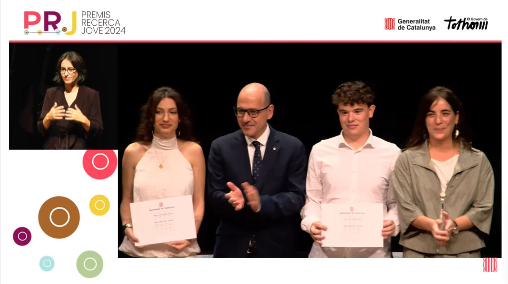 Dissabte 25 d’octubre, a l’auditori de Barcelona, es va celebrar el lliurament dels Premis Recerca Jove 2024. Pau Portabella i Queralt Núñez, exalumnes de l’escola, van recollir els seus respectius premis al seu treball de recerca i l’Eulàlia Riera, directora de l’escola, va recollir el Premi Recerca Jove a l’Escola Mestral. L’acte va estar presidit per la consellera de Recerca i Universitats, Núria Montserrat, que en va fer la cloenda.